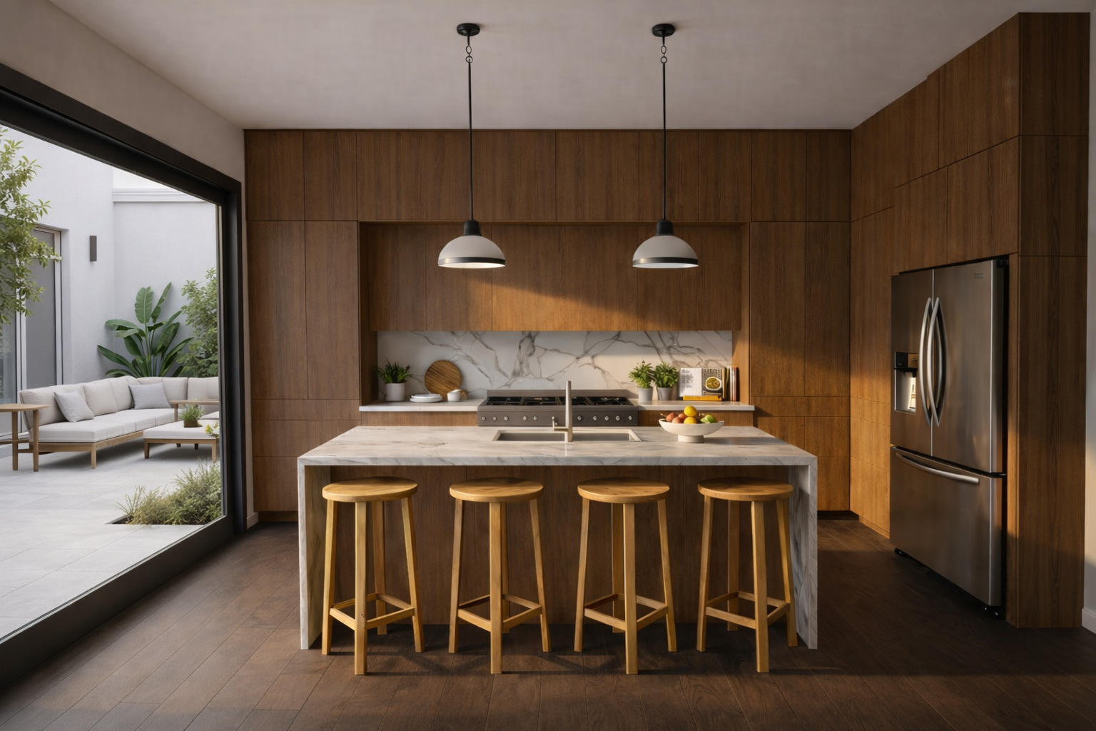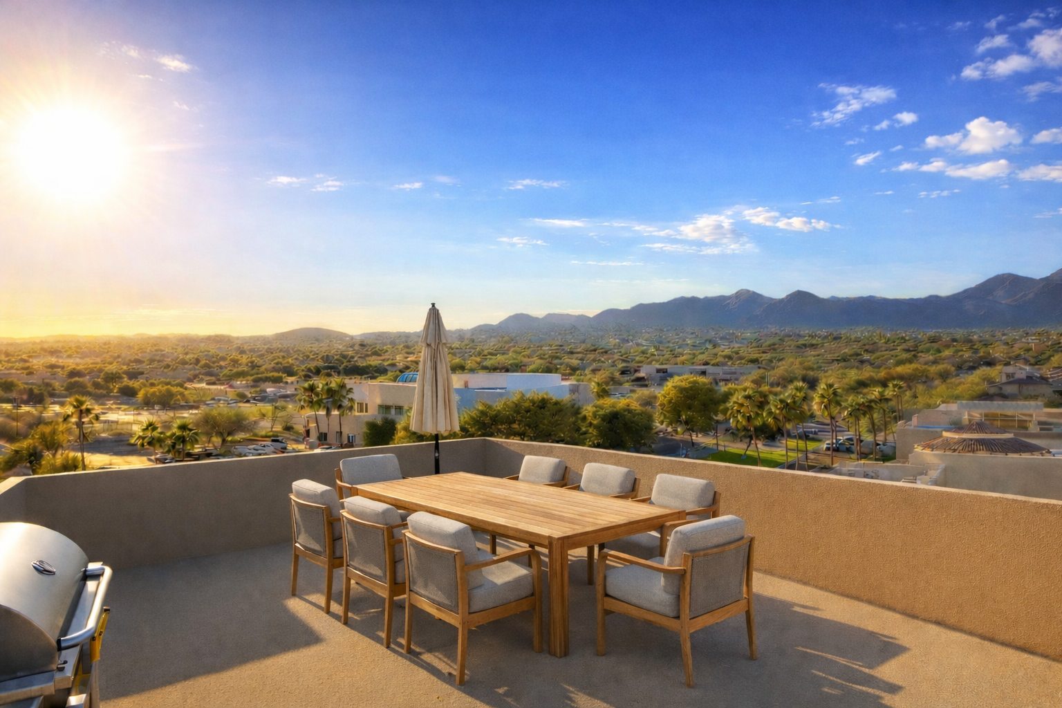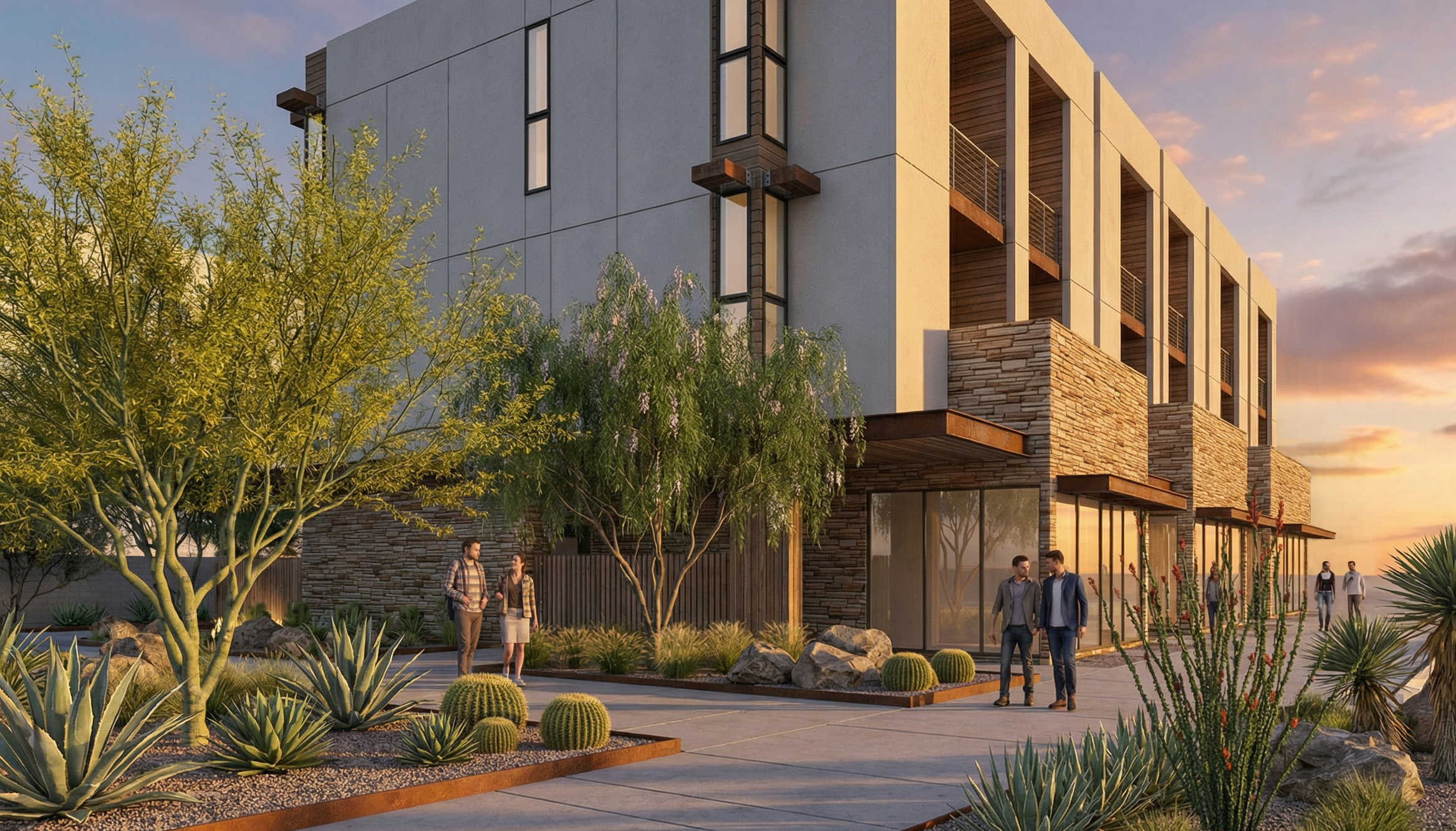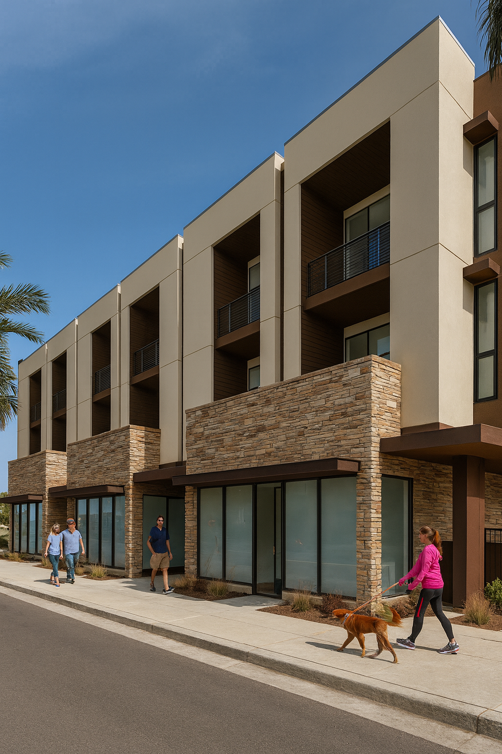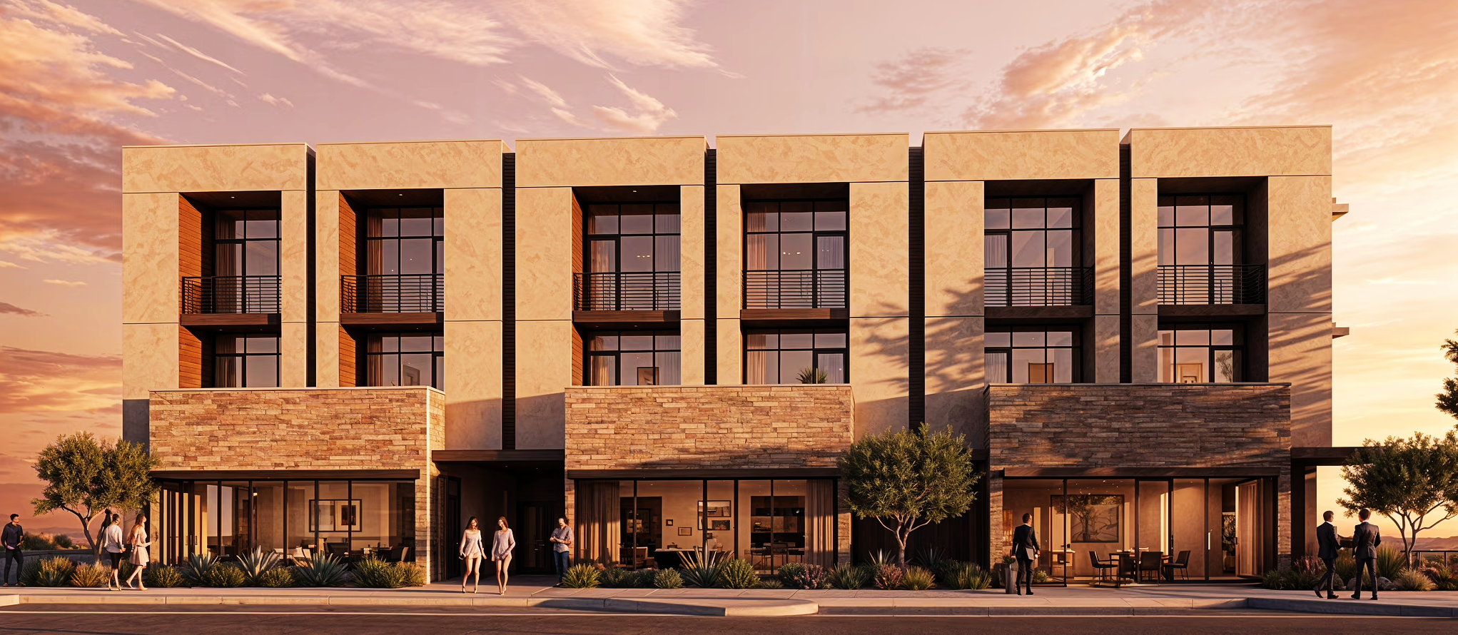 The Avenue’s architecture features a sophisticated balance of stone, glass, and warm earth tones that harmonize with the surrounding desert landscape. Each residence offers an open-concept layout flooded with natural light, designer finishes throughout, and private outdoor living spaces including a backyard and rooftop terrace with panoramic mountain and fountain views.